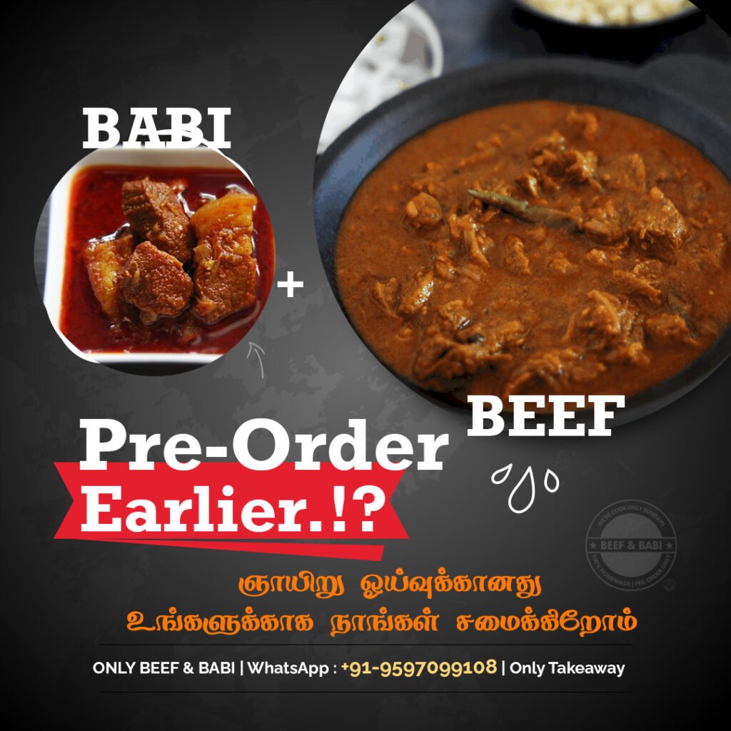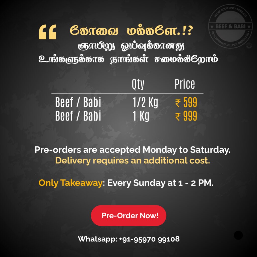 கோயம்புத்தூரில் தங்கிப் படிக்கும் அல்லது வேலை செய்யும் நண்பர்களே, ஞாயிறன்று ஒரு வேளையாவது வீட்டில் செய்த மாட்டுக்கறி அல்லது பன்றிக்கறி சாப்பிட வேண்டும் என்று ஆசையாக இருக்கிறதா? இதோ, உங்களுக்காக நாங்கள் சமைத்துத் தருகிறோம்! ½ கிலோ அல்லது 1 கிலோ என்று நீங்கள் வீட்டில் எவ்வாறு சமைப்பீர்களோ, அதே அளவில் நாங்களும் சமைத்துத் தருகிறோம். கடைகளைப் போல குழம்பு அதிகமாகவும், கறி குறைவாகவும் தரும் எடைக் கணக்கில் அல்ல!